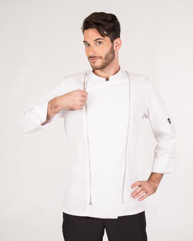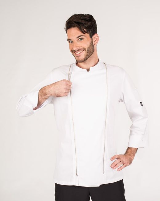 Chaqueta GASTROCHEF unisex, en manga larga, con cuello mao, puños vueltos, un bolsillo en la manga izquierda y cierre cruzado mediante cremallera metálica con separador para poder cerrar en ambos sentidos. Modelo semi ajustado, confeccionado en SARGA de color blanco con COOLMAX en la espalda. Ideal para uniforme de camareros, cocineros y chefs en hostelería, restauración y cocina en general.