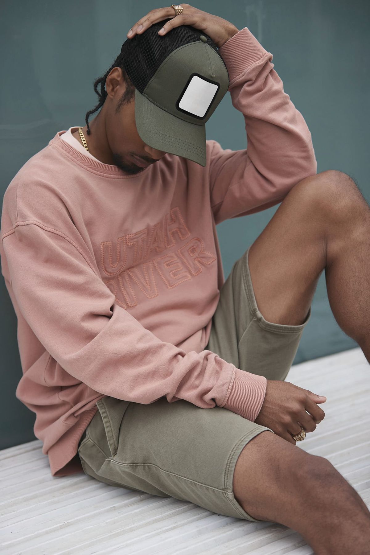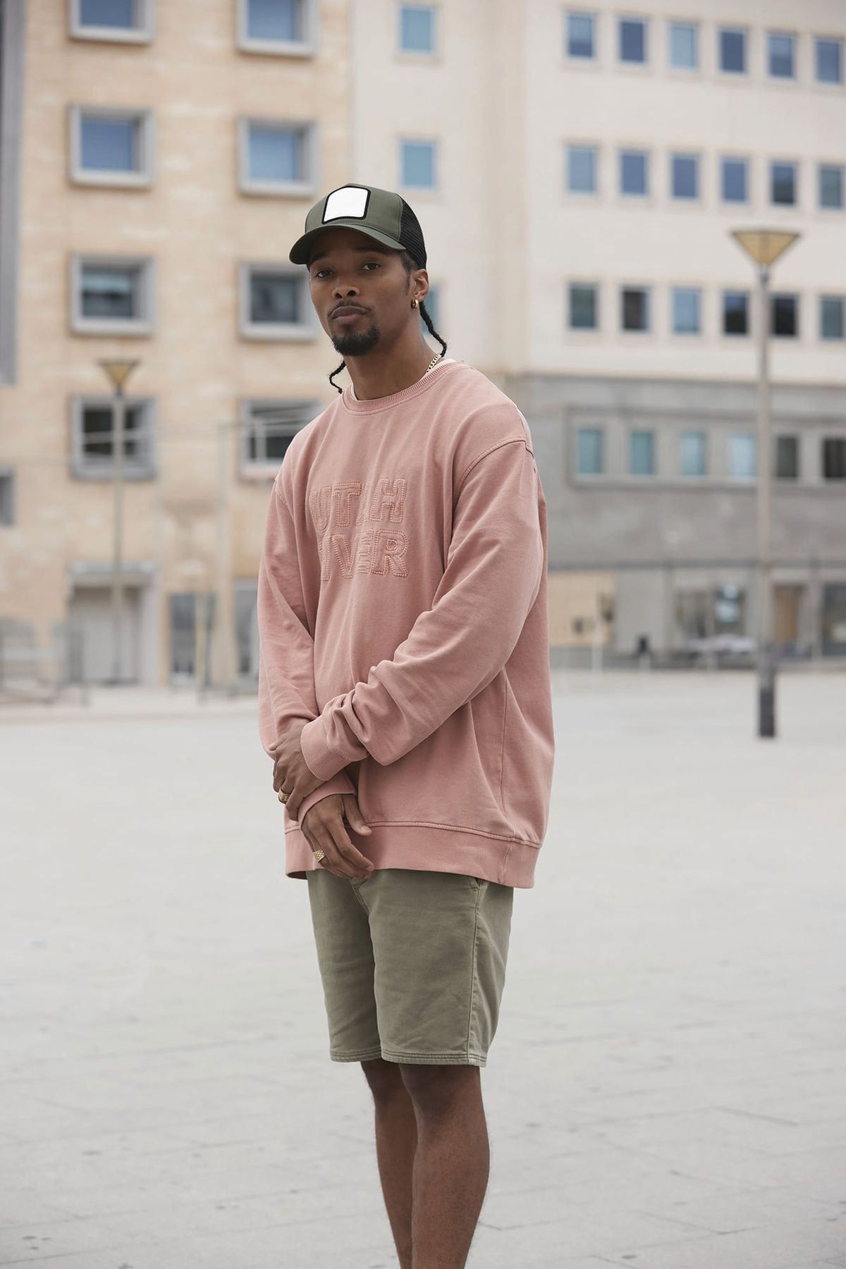 Pannello frontale 100% cotone e pannello posteriore 100% poliestere riciclato. Design a 5 pannelli. Patch applicato in twill di cotone per la decorazione.