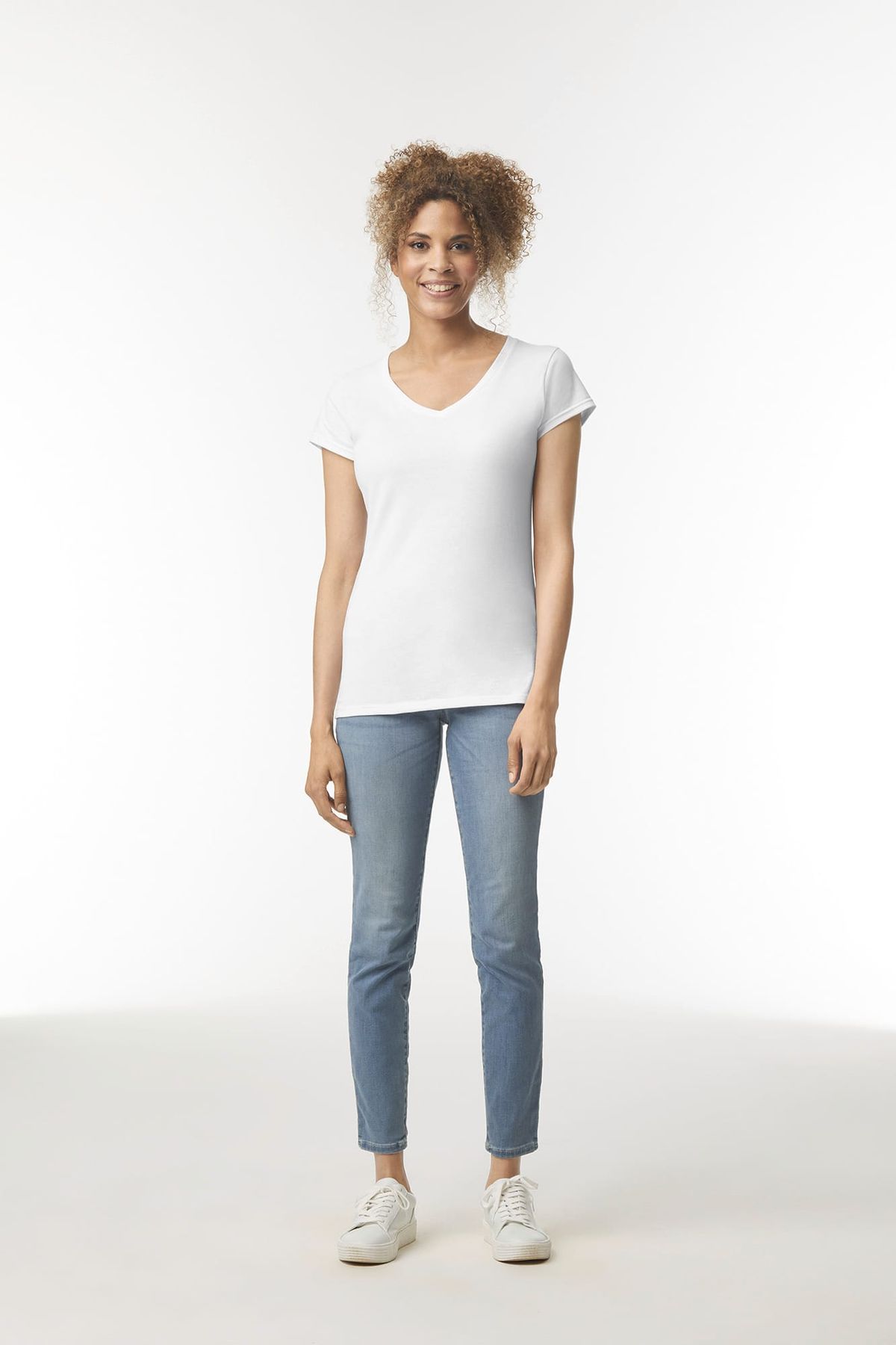 · 144-153 g / m² · 100% cotone jersey pre-ridotto (Sport Grey: 90% cotone, 10% poliestere. Heather: 35% cotone, 65% poliestere) · Molto morbido, Softstyle® · Collo a costine senza cuciture a vista · Nastrato sul collo e sulle spalle · Scollo a V · Cuciture laterali affusolate · Orlo della manica e orlo inferiore a doppio ago · Girato di un quarto per eliminare le rughe centrali